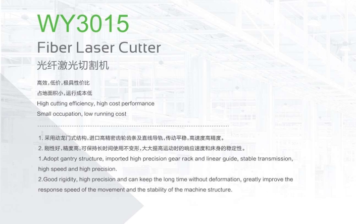 WY3015光纤激光切割机 高效,低价,机具性价比。占地面积小,运行成本低。 1,采用动龙门式结构,进口高精密齿轮齿条及直线导轨,传动平稳,高速度高精度。 2,刚性好,精度高,可保持长时间使用不变形,大大提高运行时的响应速度和床身的稳定性。